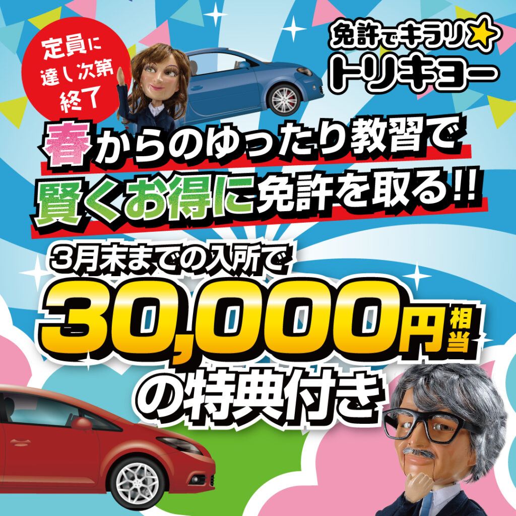 自由教習ご入校をご検討されていたお客様には、大変ご迷惑をおかけいたしますことを深くお詫び申し上げます。受付再開の際には、改めてご案内させていただきますので、今しばらくお待ちいただけますようお願い申し上げます。